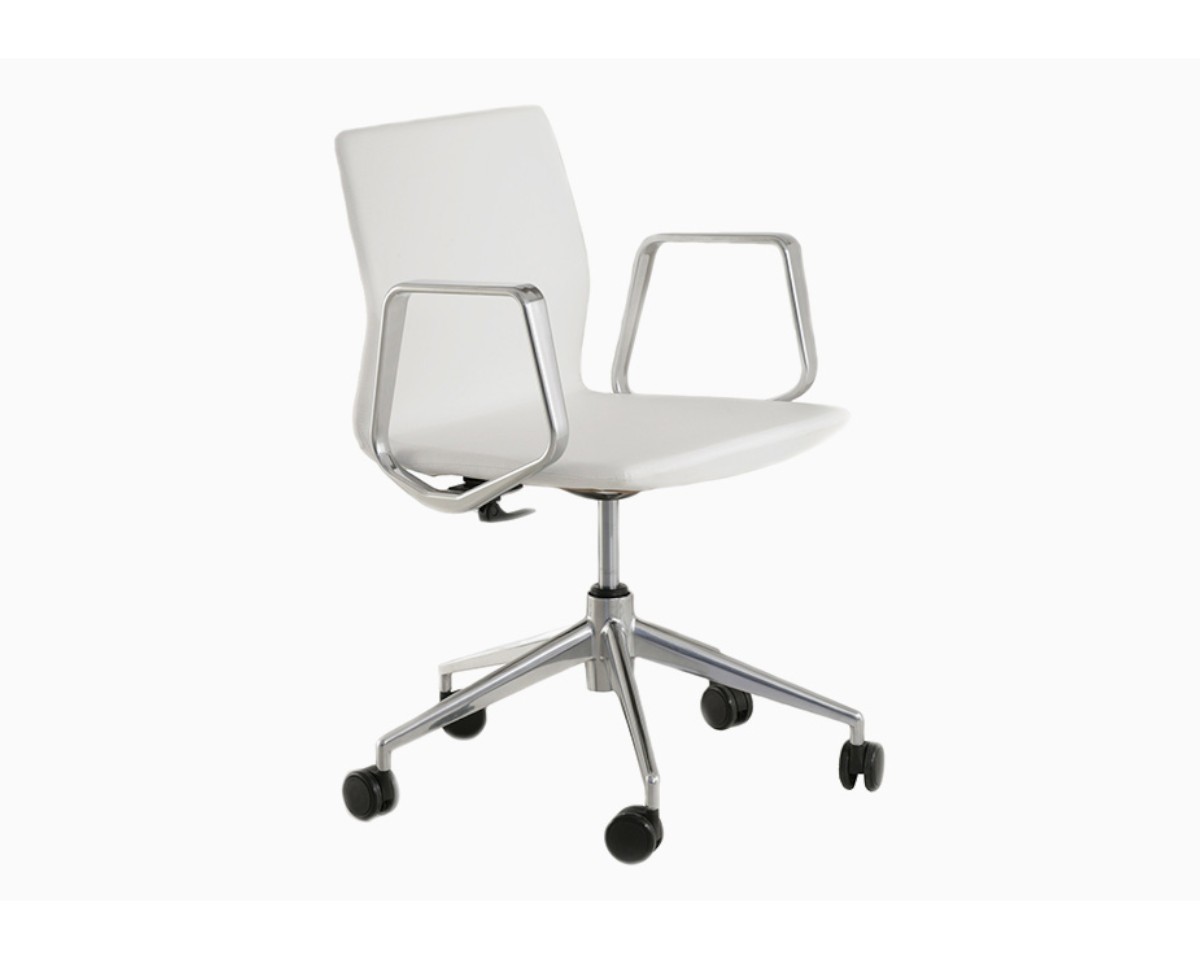 Con un perfil de líneas esbeltas y ergonómicas, su carcasa continua de respaldo bajo inyectada en PU refleja un estilo único. Los brazos de aluminio característicos de la colección aportan personalidad a un diseño elegante y versátil, inspirado en la icónica lámpara Boomerang.