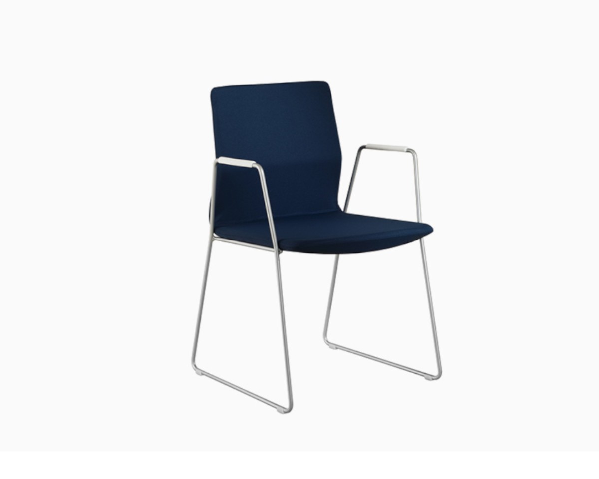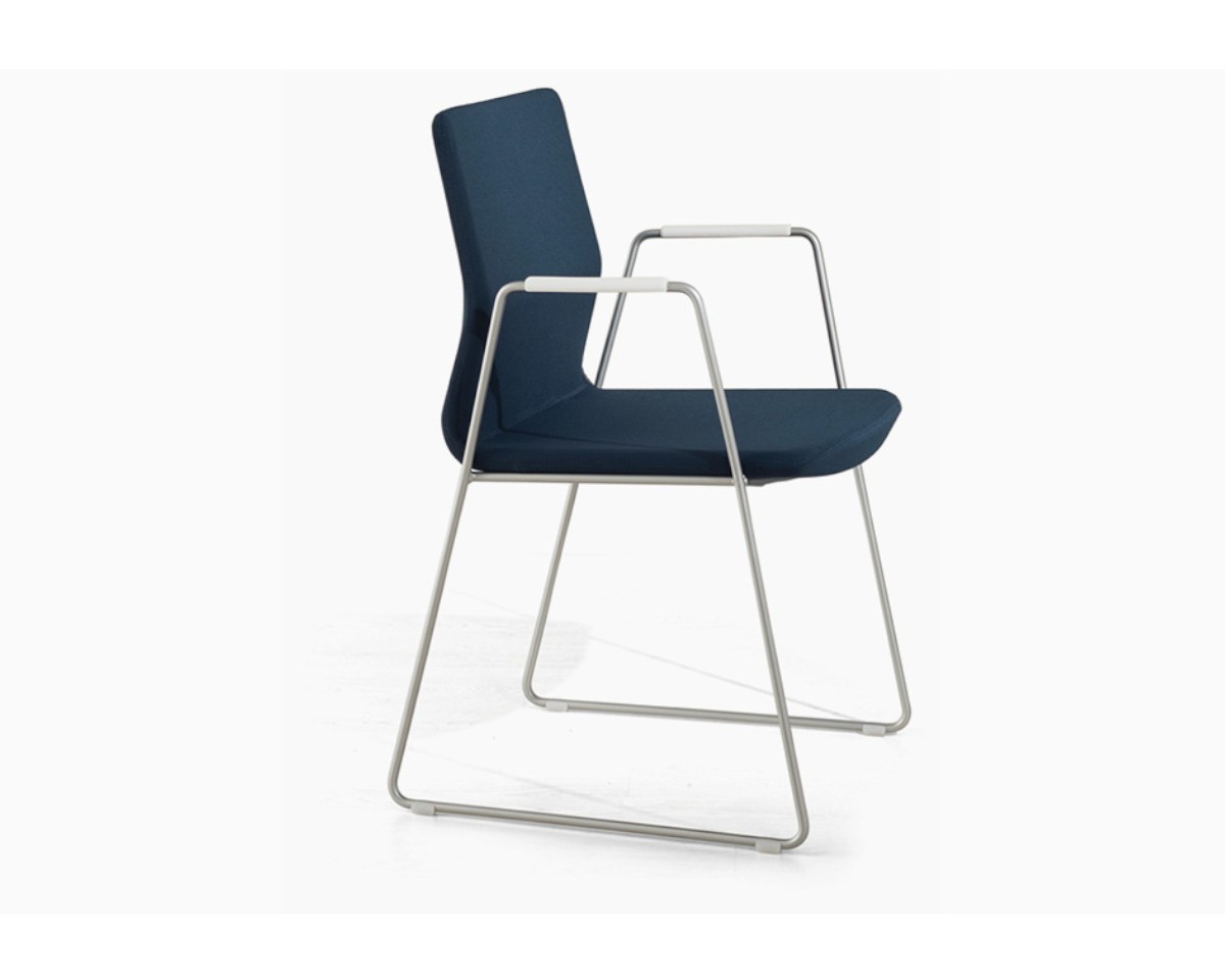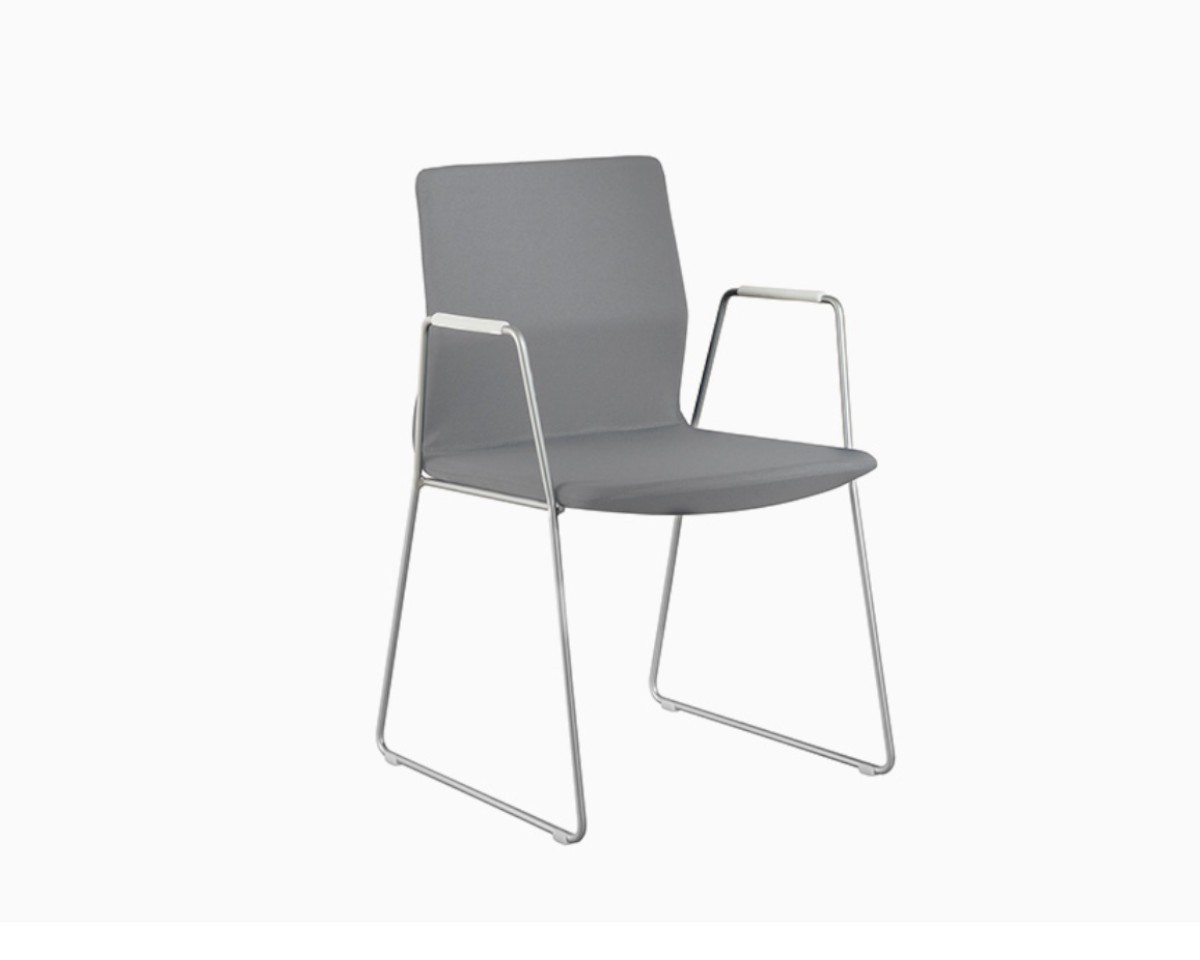 La colección ofrece un amplio abanico de acabados y configuraciones: desde estructuras metálicas con o sin brazos, en diferentes colores y materiales, hasta versiones con base giratoria de cinco radios con ruedas o deslizantes. Una silla multifunción que encaja en cualquier entorno profesional.