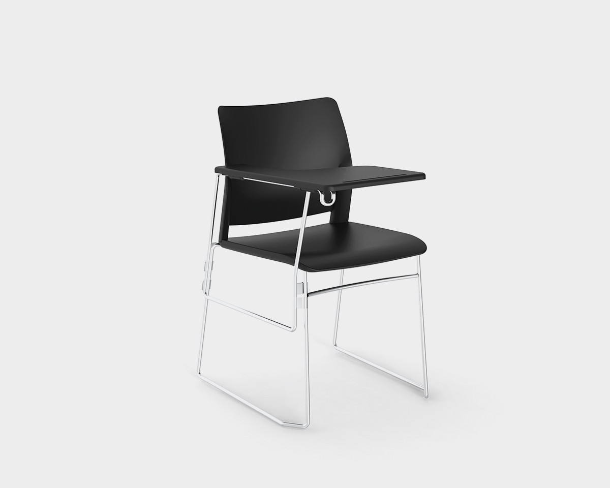 Los modelos fijos de 4 patas o patín cerrado son totalmente apilables, facilitando el almacenamiento y la reorganización de los espacios. También se ofrecen versiones con o sin brazos y la posibilidad de incorporar pala de escritura abatible, ideal para aulas o salas de formación. SPACIO dispone de prácticos carros porta-sillas y de palas, que optimizan su transporte y almacenamiento.
