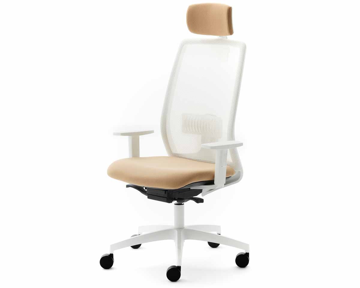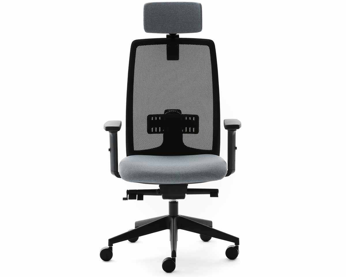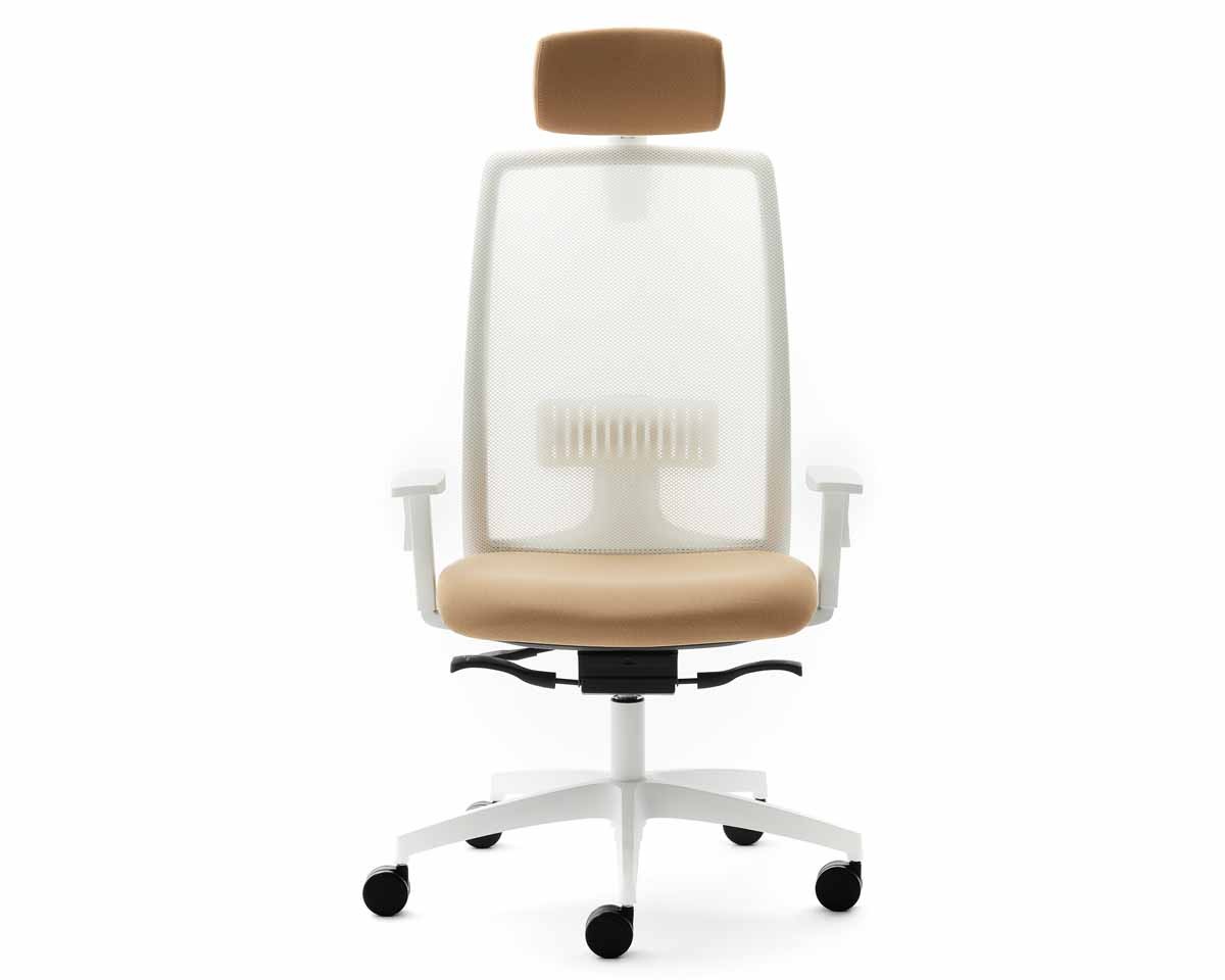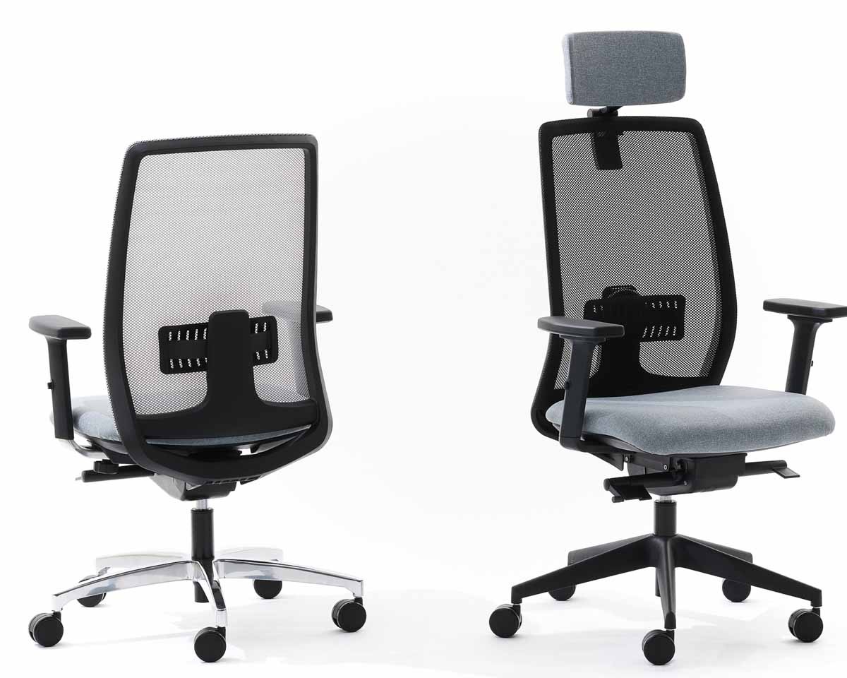 El respaldo alto en malla transpirable ofrece excelente ventilación y un apoyo cómodo para la espalda, y está disponible en marco perimetral de polipropileno color negro o blanco. Puede incluir cabecero ajustable tapizado o de malla, según modelo. Además, se puede incorporar un tensor lumbar 1D o 2D para mejorar el soporte lumbar, con regulación en altura (y profundidad en el 2D), adaptándose a diferentes usuarios.