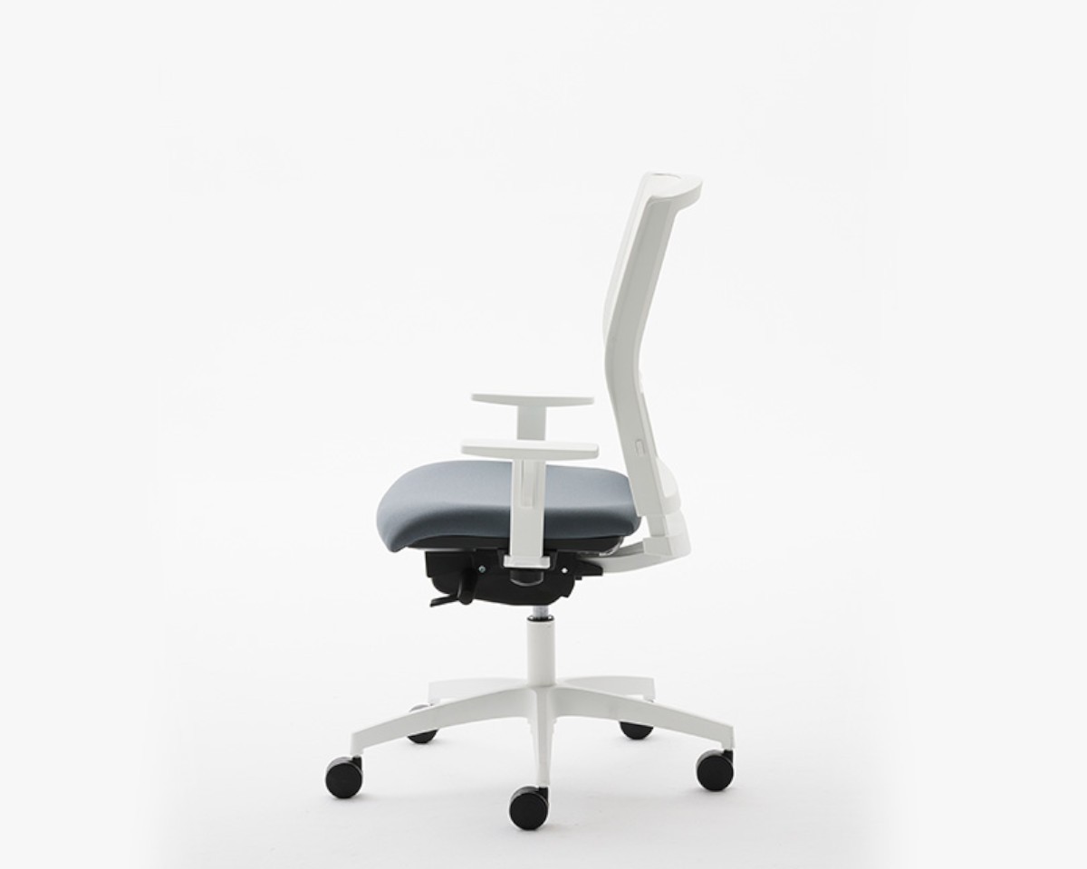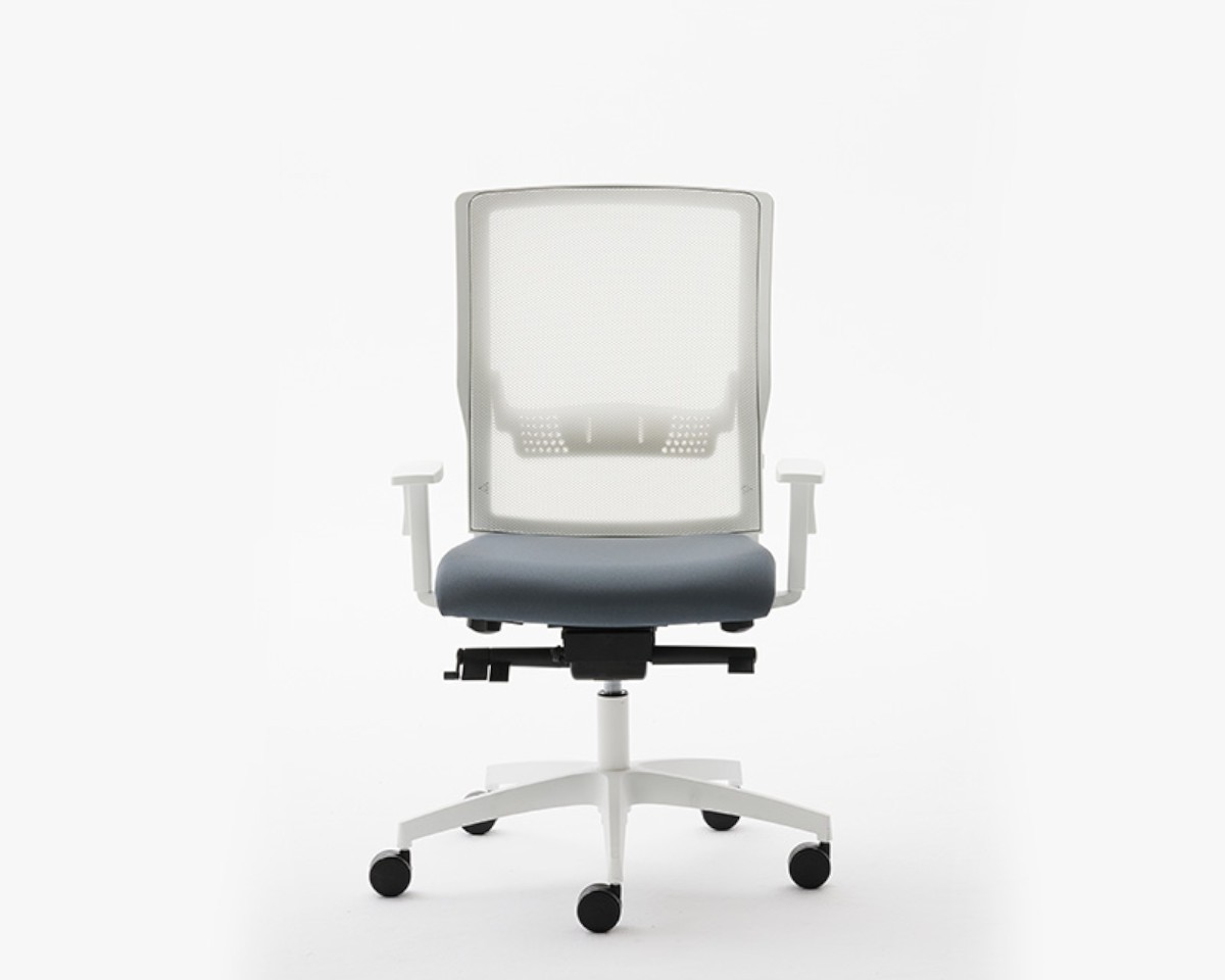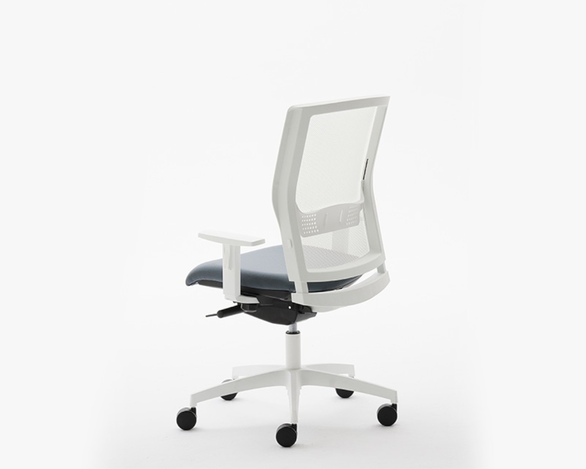 La regulación en altura del respaldo se activa con dos botones laterales que permiten un ajuste preciso y ergonómico. Además, el tensor lumbar flexible en PP es ajustable de forma independiente, con opción de personalización en tapizado 3D. También incorpora tarjetero trasero para identificar al usuario, una solución funcional y elegante.