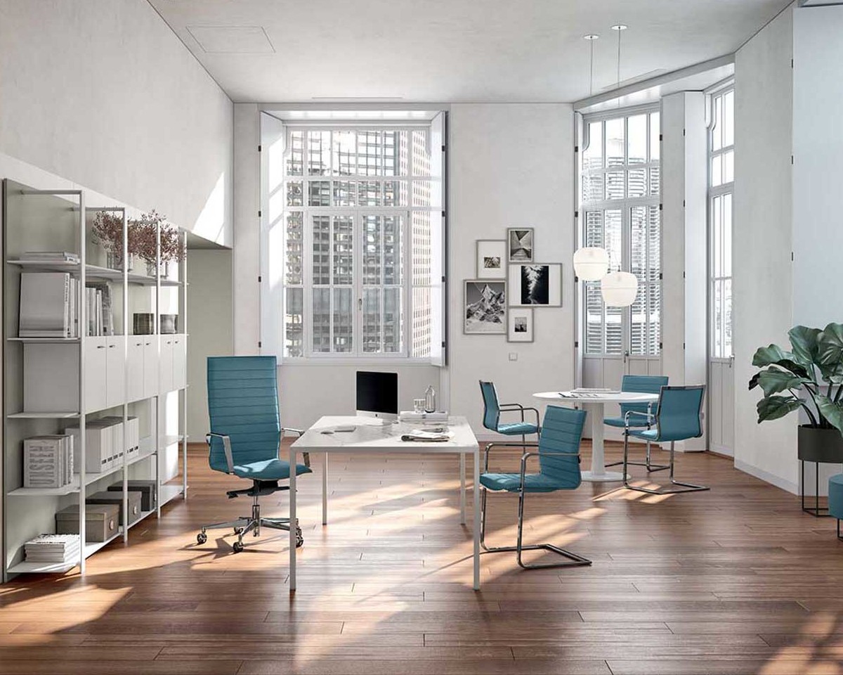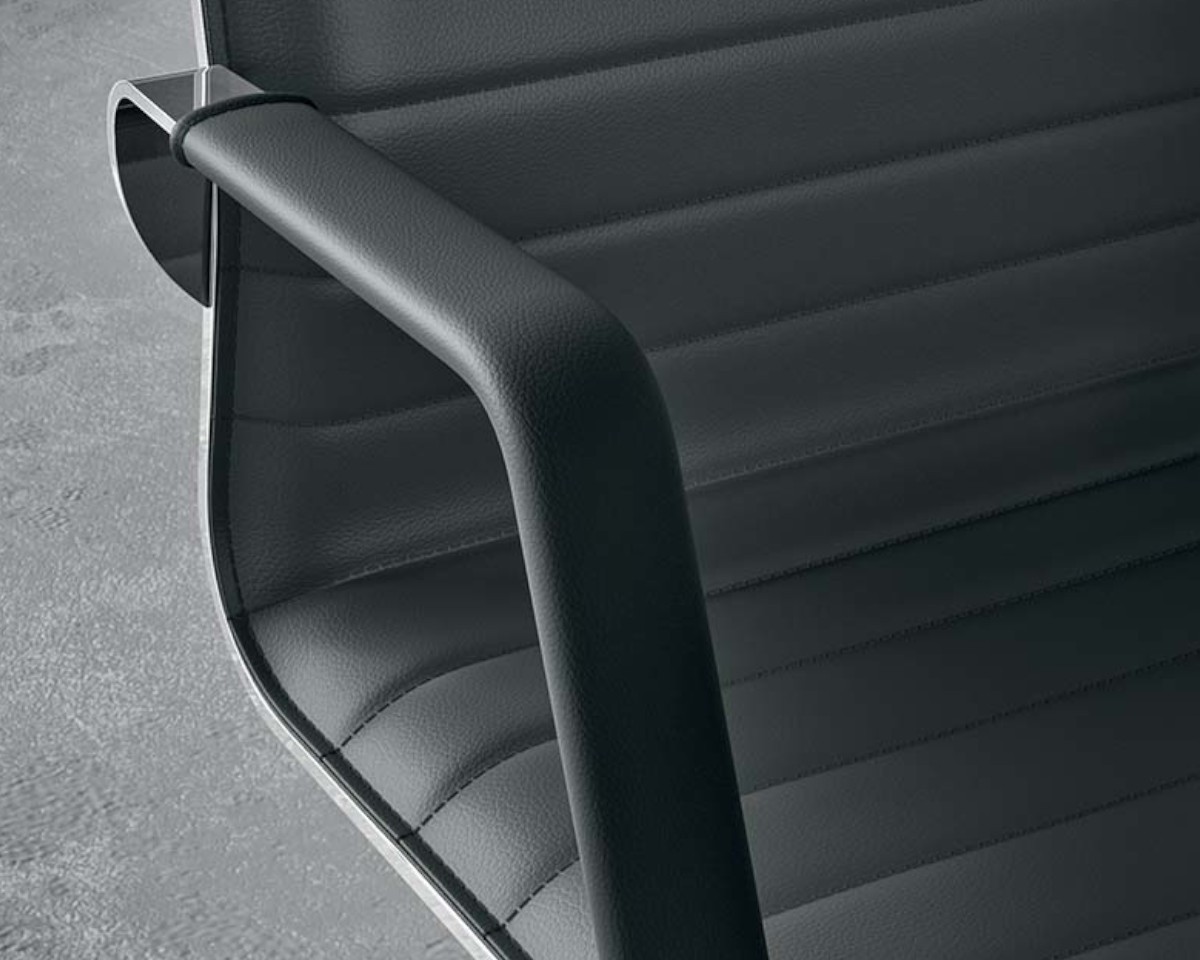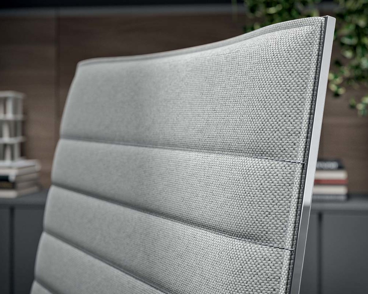 Su diseño versátil se adapta a distintos contextos gracias a las variantes de base disponibles: la versión con base de patín aporta una imagen formal y sobria, ideal para salas de reuniones, mientras que el modelo con base giratoria de 5 radios con ruedas ofrece funcionalidad y movimiento para puestos de trabajo directivos.