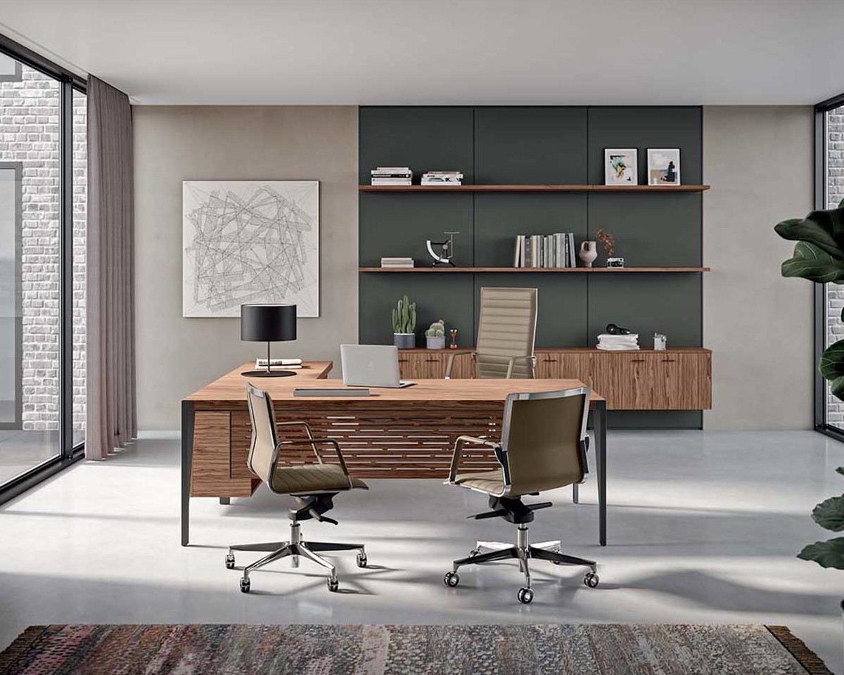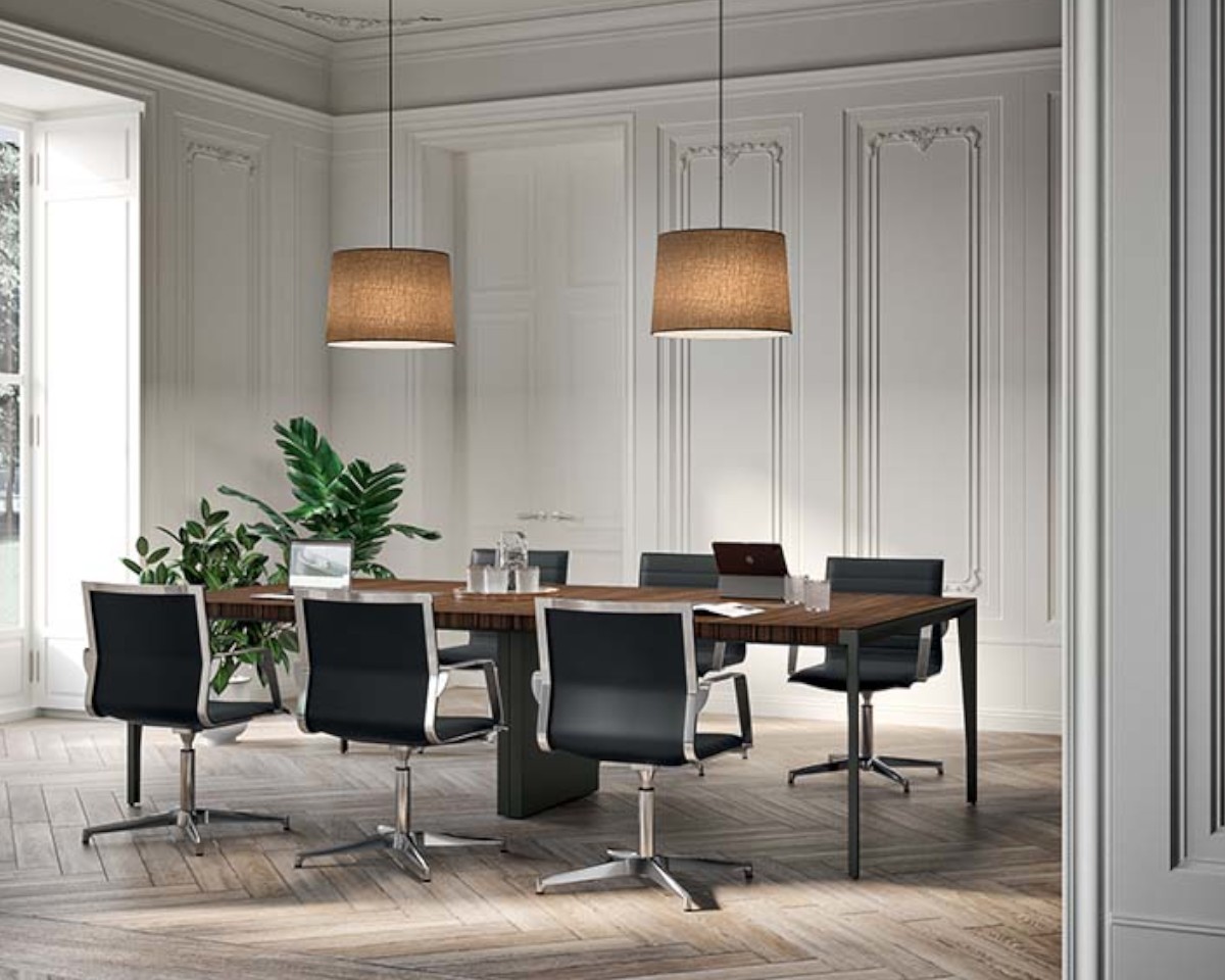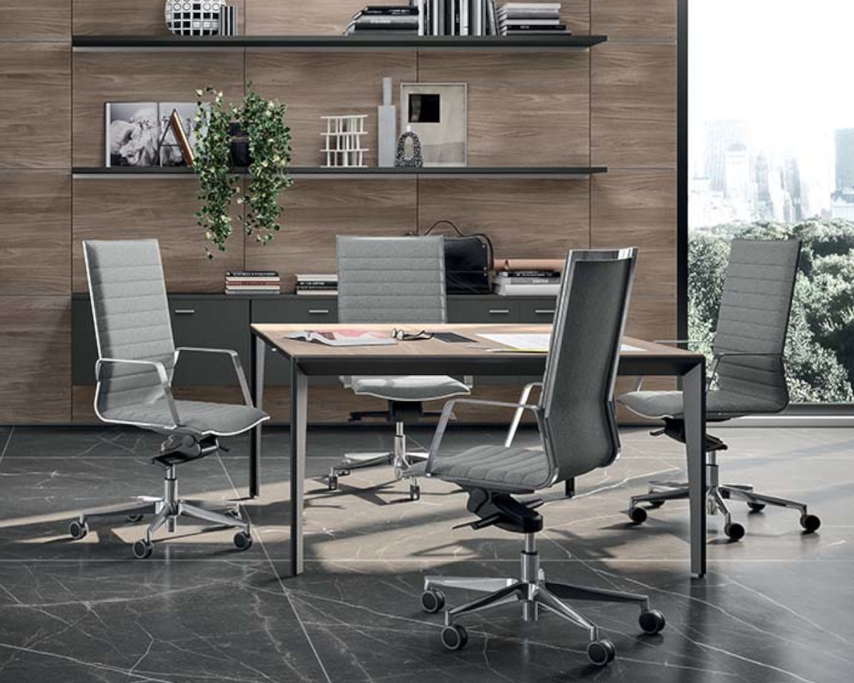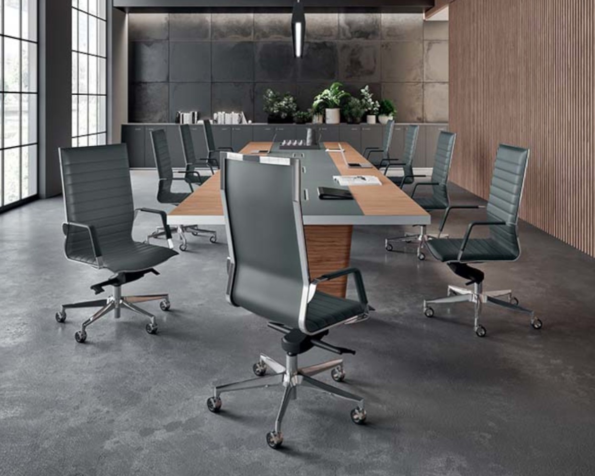Su diseño versátil se adapta a distintos contextos gracias a las variantes de base disponibles: la versión con base de patín aporta una imagen formal y sobria, ideal para salas de reuniones, mientras que el modelo con base giratoria de 5 radios con ruedas ofrece funcionalidad y movimiento para puestos de trabajo directivos.