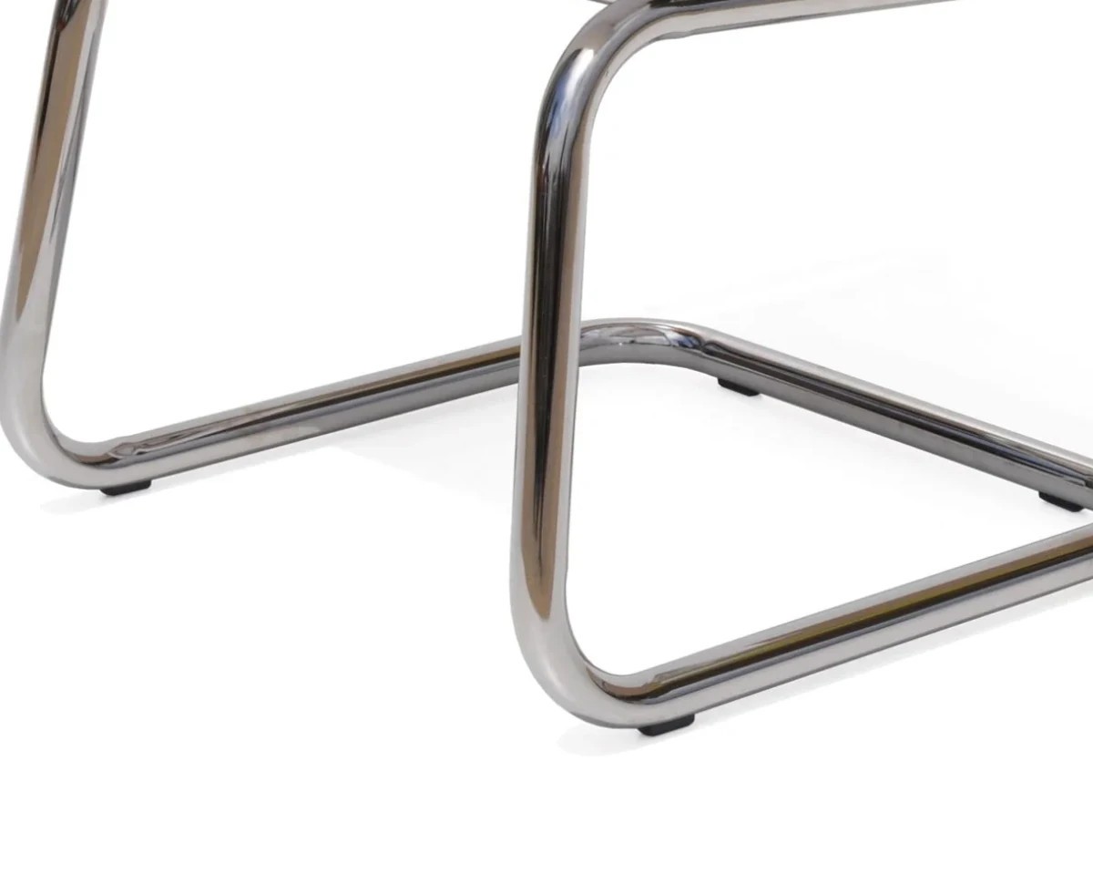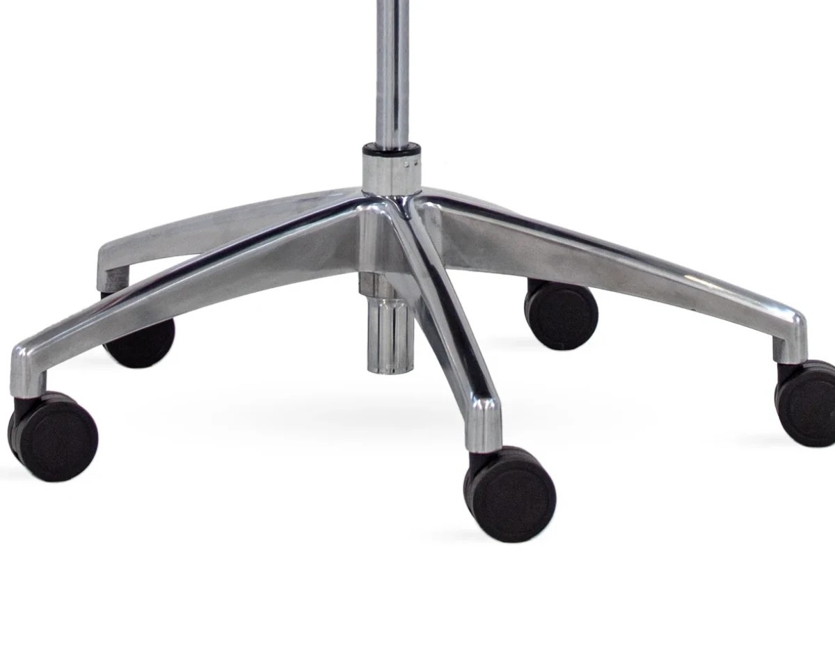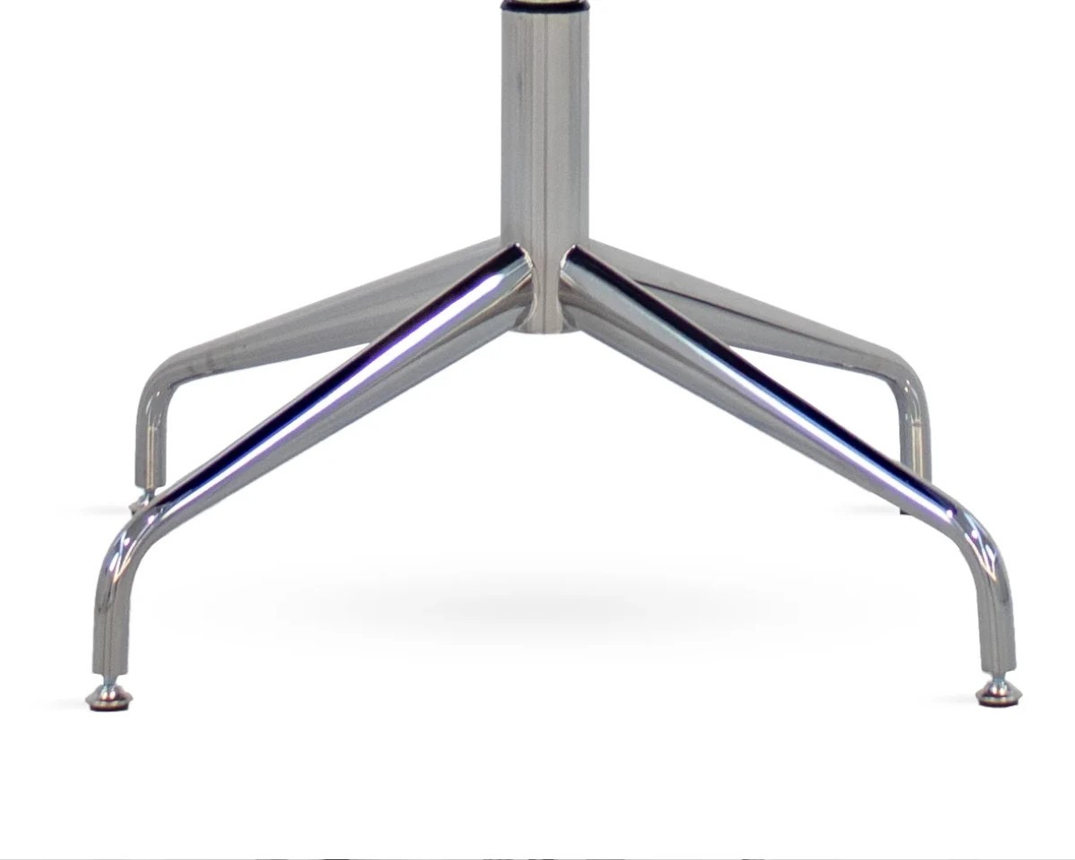 La estructura metálica cromada no solo garantiza una gran resistencia, sino que también aporta un acabado sofisticado y distintivo. Además, la base basculante permite cinco posiciones de parada según el grado de inclinación del respaldo, ajustable mediante un regulador situado en la parte inferior.